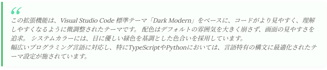 VS Code 標準のダークテーマとして搭載されている Dark Modern Theme を基に、標準のテーマカラーである青を緑に置き換えたようなシンプルなテーマになっています。