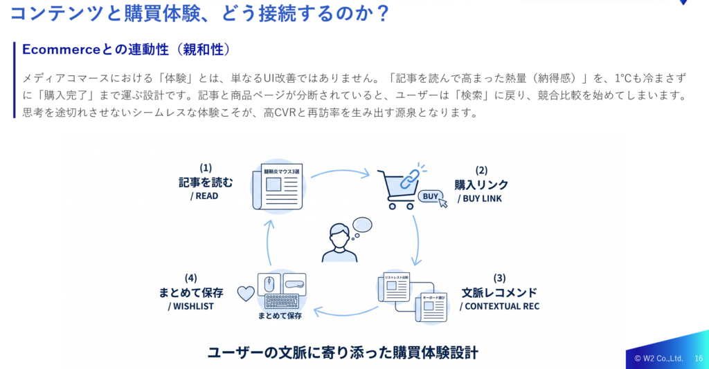 メディアコマースにおける「体験」とは、単なるコンテンツの追加ではありません。「記事を読んで高まった熱量(納得感)」を、1℃も冷まさずに「購入完了」まで運ぶ設計が核心です。