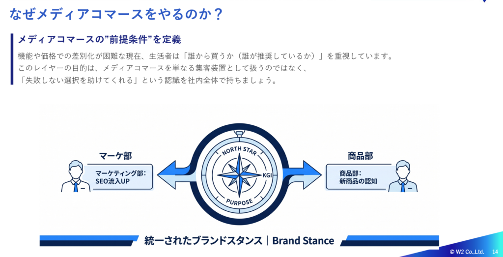 「メディアコマースをやろう」という方針が社内で下りたとき、マーケティング部が「SEO流入を増やすため」と理解していて、商品部が「新商品の認知を取るため」と理解していたとしたら、どうなるでしょうか。