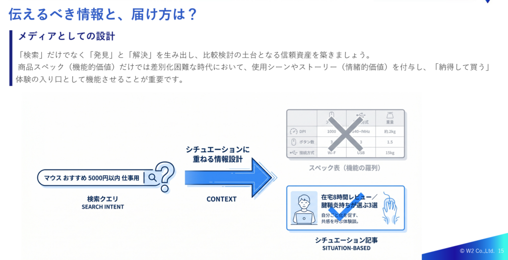 ユーザーは商品の機能を探しているのではなく、自分のシチュエーションに重ねられる情報を探しています。デメリットや失敗談を含む、情報の透明性がそのまま信頼とCVRを高めます。