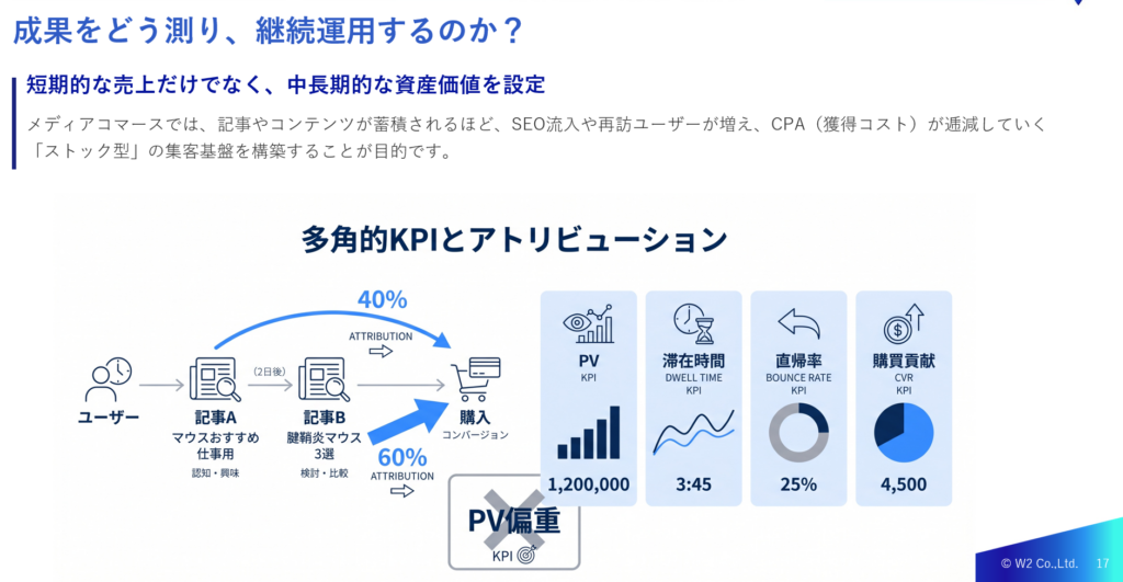 メディアKPI(読了率・再訪率・態度変容)とEC KPI(CVR・LTV)を分離して設計し、短期ROIと中長期の資産価値を並走させて評価する体制が、継続運用の鍵になります。