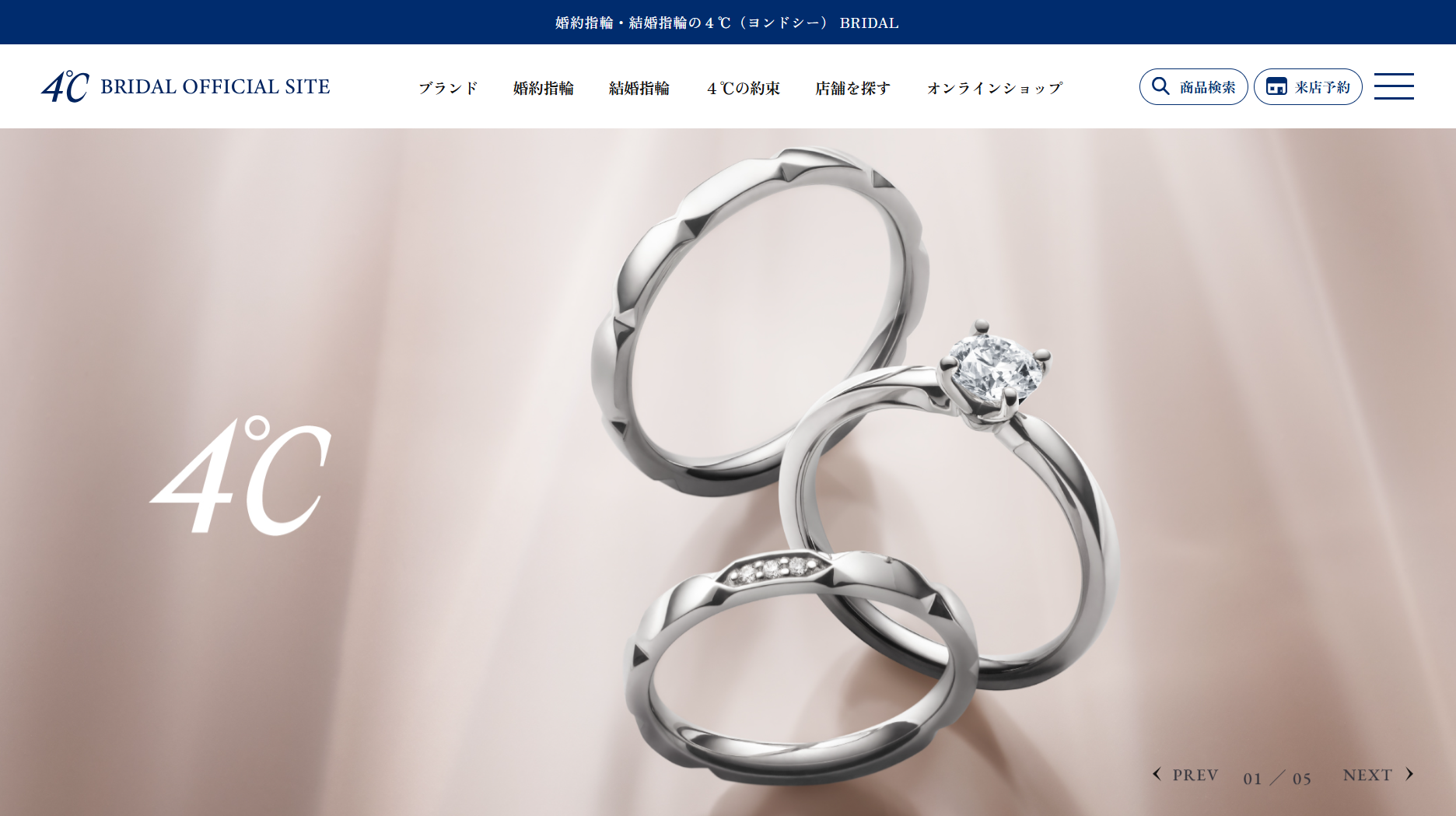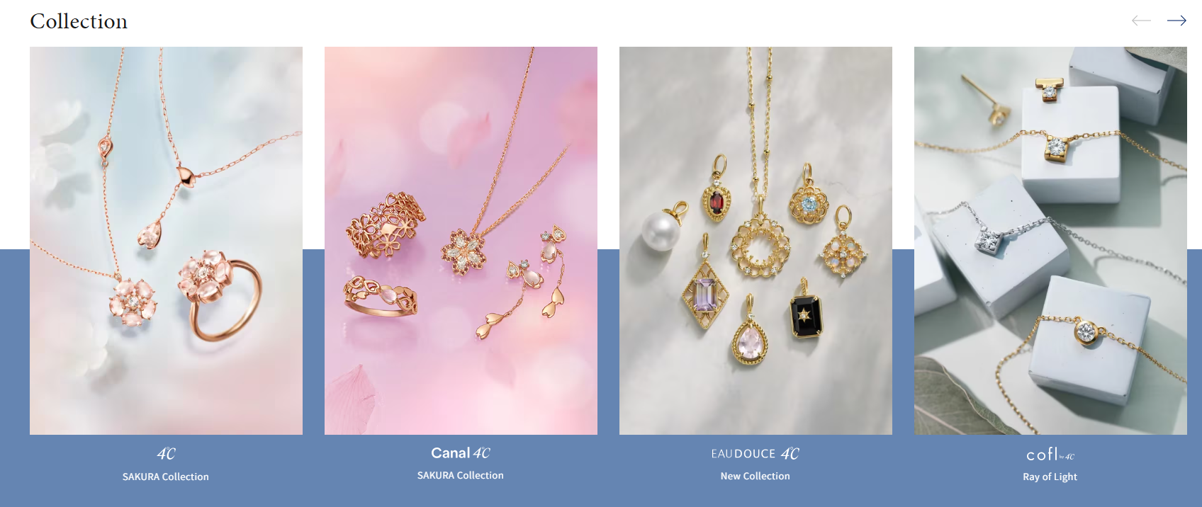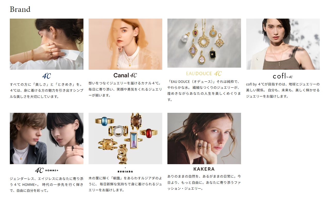 主力ブランドである「4℃」をはじめ、「EAU DOUCE 4℃」「Canal 4℃」などのブランドを展開しています。ブライダル領域では「4℃ BRIDAL」なども加わり、人生の節目に寄り添うラインナップを揃えています。