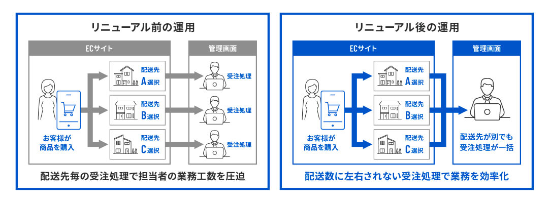 従来は複数の配送先が選択された際に、配送先毎に受注処理を行う必要があり、スタッフにとって大きな負担となっていました。現在は、全ての配送先を一度に受注処理できるようになり、受発注業務が大幅に効率化されています。