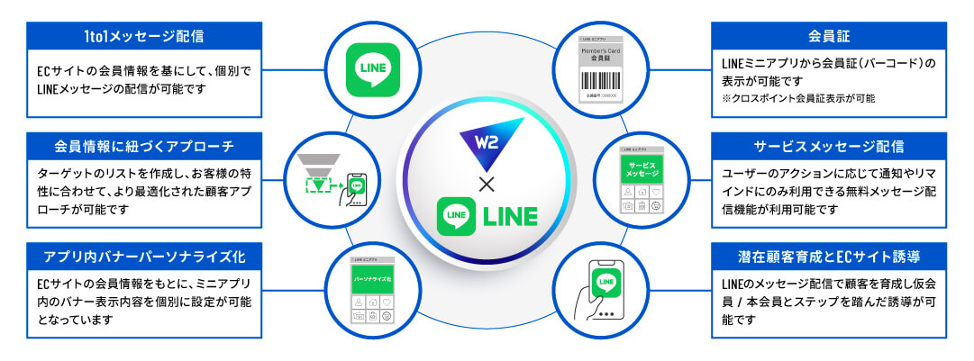 つまり、「店舗来店→LINE登録→継続的な情報発信→ECサイト購入→再来店」という購買活動の好循環を創出するためには、店舗・ECサイト・LINEが一体となった連携が不可欠であり、それを技術的に可能にするシステムがまさにW2でした。