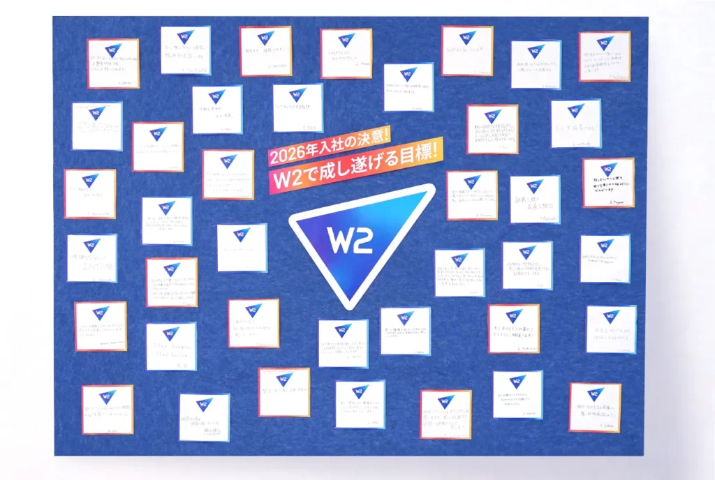 2026年度は42名の新入社員を迎え、組織としての一体感と主体的なキャリア形成を促すために、昨年に引き続き、新入社員一人ひとりにW2で成し遂げたい目標を「ビジョンマップ」に描いてもらいました。
