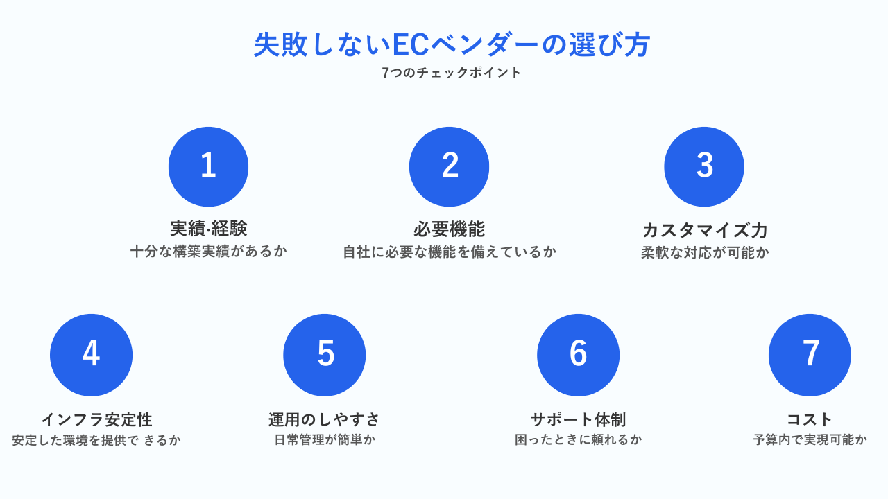 続いて、自社に合うECベンダーやパッケージを選ぶにあたり、押さえておきたいおすすめの選定基準や比較ポイントを7つ紹介します。