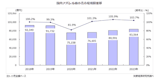 アパレル市場は2018〜2019年は横ばい推移ののち、2020年には7兆5,158億円(前年比81.9%)まで大きく落ち込みました。