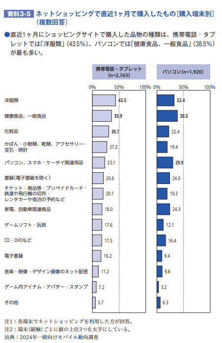 さらに、NTTドコモ モバイル社会研究所の『2024年版モバイル動向調査』データでは、携帯電話・タブレットを利用した購入品目のトップは「洋服類」(43.5%)であり、他のどの商品よりも高い割合を占めています。