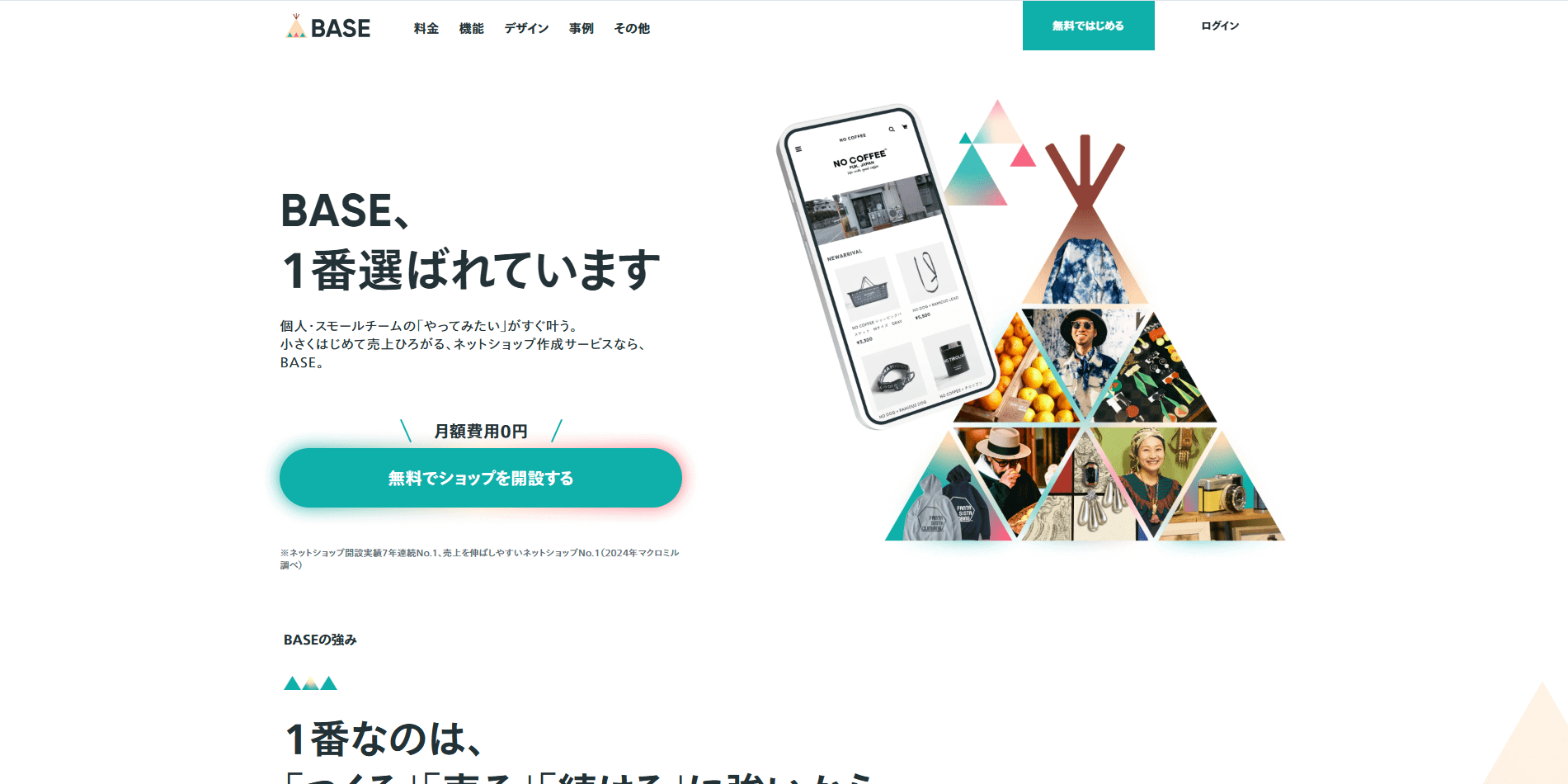 BASEは初期費用・月額費用が完全無料で始められる国内最大級のネットショップ作成サービスです。ネットショップ開業において障壁となる「初期投資のリスク」を完全に排除できる点が最大の魅力で、商品が売れるまで一切の固定費が発生しません。そのため資金力に不安がある個人や、まずは副業として小さく始めたい企業にとって理想的なECプラットフォームです。