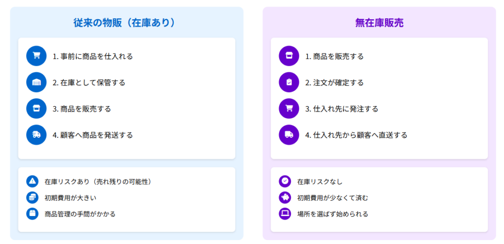 無在庫販売と有在庫販売の最大の相違点は、商品を販売する前に在庫を事前に仕入れて持つかどうかという点です。