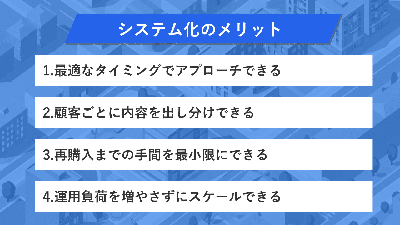 購入後のフォローや再購入の提案をシステム化することで、安定して最適なオファーが実行できるようになります。