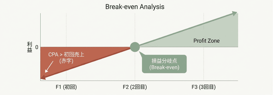 よく「1:5の法則(新規獲得コストは維持コストの5倍)」と言われますが、F2転換の重要性はそれ以上に「損益分岐点の突破」にあります。