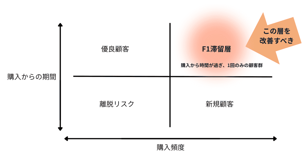 RFM分析(Recency、 Frequency、 Monetary)を活用し、F1(初回客)の状態を分解します。特にF2転換においては「R(最新購入日)」が重要です。「初回購入から60日以上経過し、購入回数が1回の層」がどれだけ滞留しているかを可視化することで、改善のインパクトを把握できます。