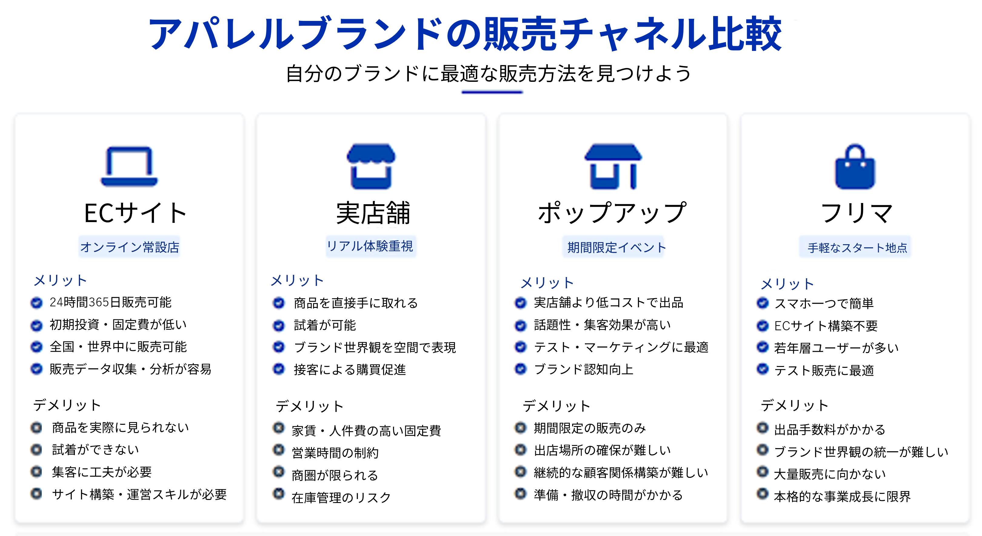 商品を販売するチャネルの選択は、ブランドの売上と成長を大きく左右します。実店舗、ポップアップストア、ECサイトなど様々な選択肢があります。
