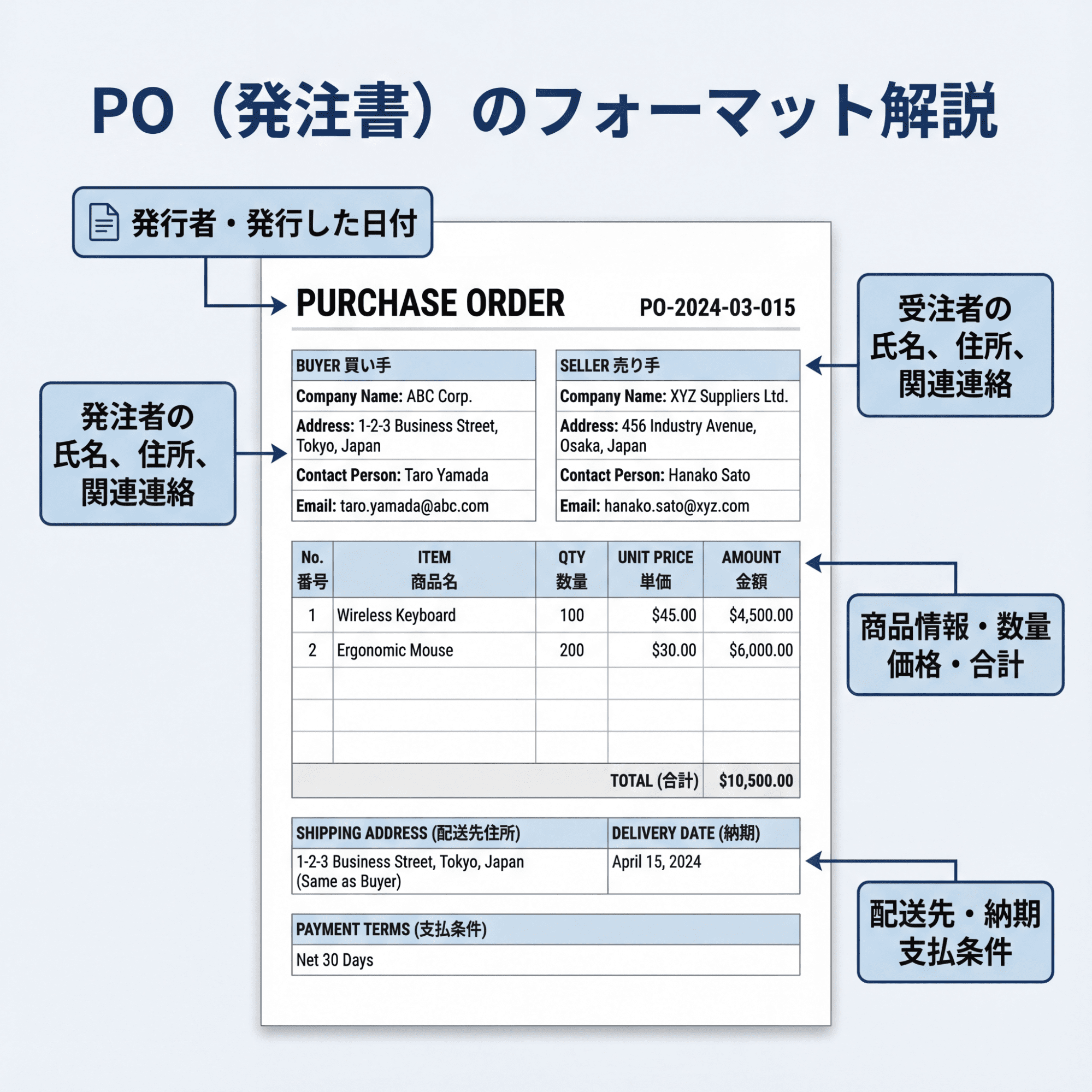 POには、取引を特定し、スムーズに履行するために以下の情報を必ず記載します。