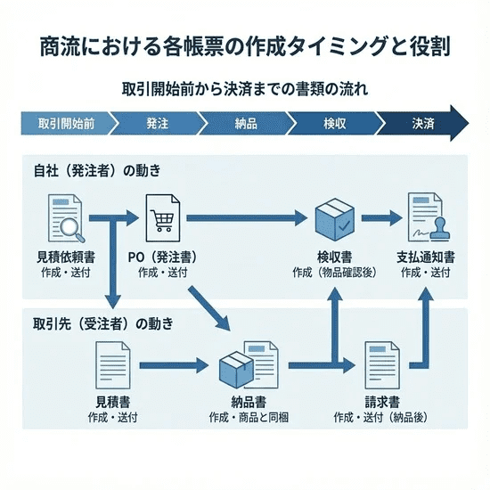 つまり、取引の流れとしては「POが先、Invoiceが後」となります。POの内容に基づいて納品が行われ、その結果に基づいてInvoiceが作成されるという関係性を理解しておきましょう。