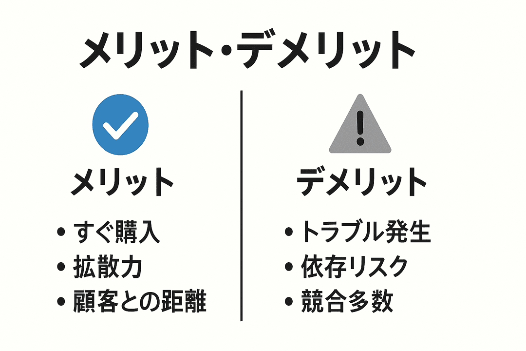 ECサイトの構築を省けて手軽に運営できる、SNS上での交流を通じてユーザーの囲い込みやファン化がしやすい、購入までの離脱率を抑えられるといったメリットがあります。