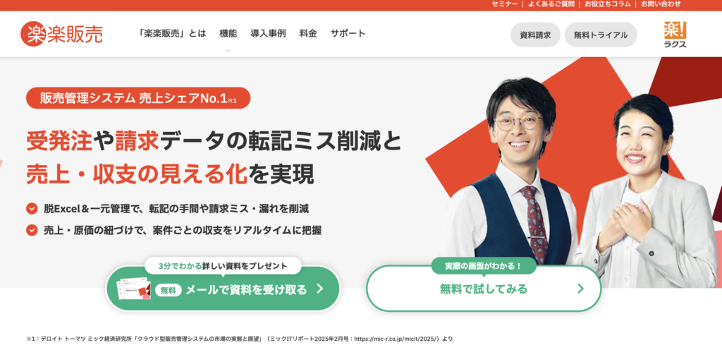 楽楽販売(株式会社ラクス) は、請求管理だけでなく、案件管理、見積書作成、発注・受注管理など、販売管理業務全体を一元管理できるシステムです。Excelやメールでの属人的な管理から脱却し、営業プロセス全体を効率化したい企業におすすめです。