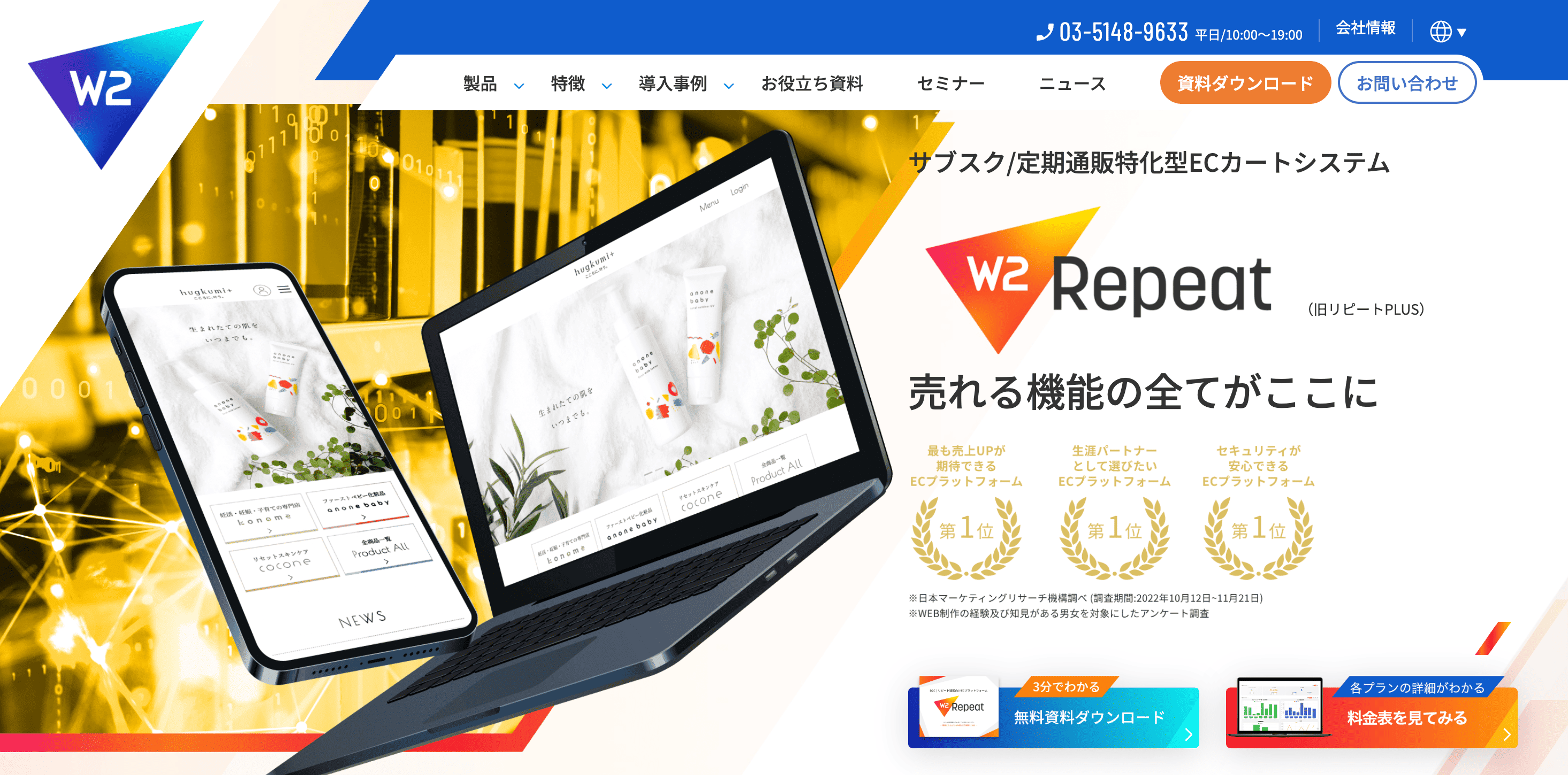 サブスク管理もできるカートシステムがW2 Repeatです。リピート通販事業を成功に導くことに特化したシステムで、導入した企業は平均売上成長率354%、業務効率化による工数を90%削減などの成果をあげています。