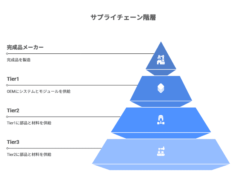 サプライヤーは一律ではなく、その役割や取引の深さによって階層構造を形成しています。特に製造業においては、この階層を理解することがリスク管理の第一歩となります。